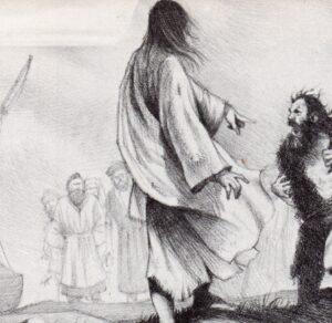 Cuando Jesús salió de la barca y se dirigió hacia Decápolis, vio en la distancia a un hombre que corría locamente a su encuentro y supo inmediatamente lo que se acercaba. El hombre vino a Jesús, se arrodilló ante él y dijo: «¿Qué quieres conmigo, Jesús, Hijo del Dios Altísimo? Jura por Dios que no me atormentarás».